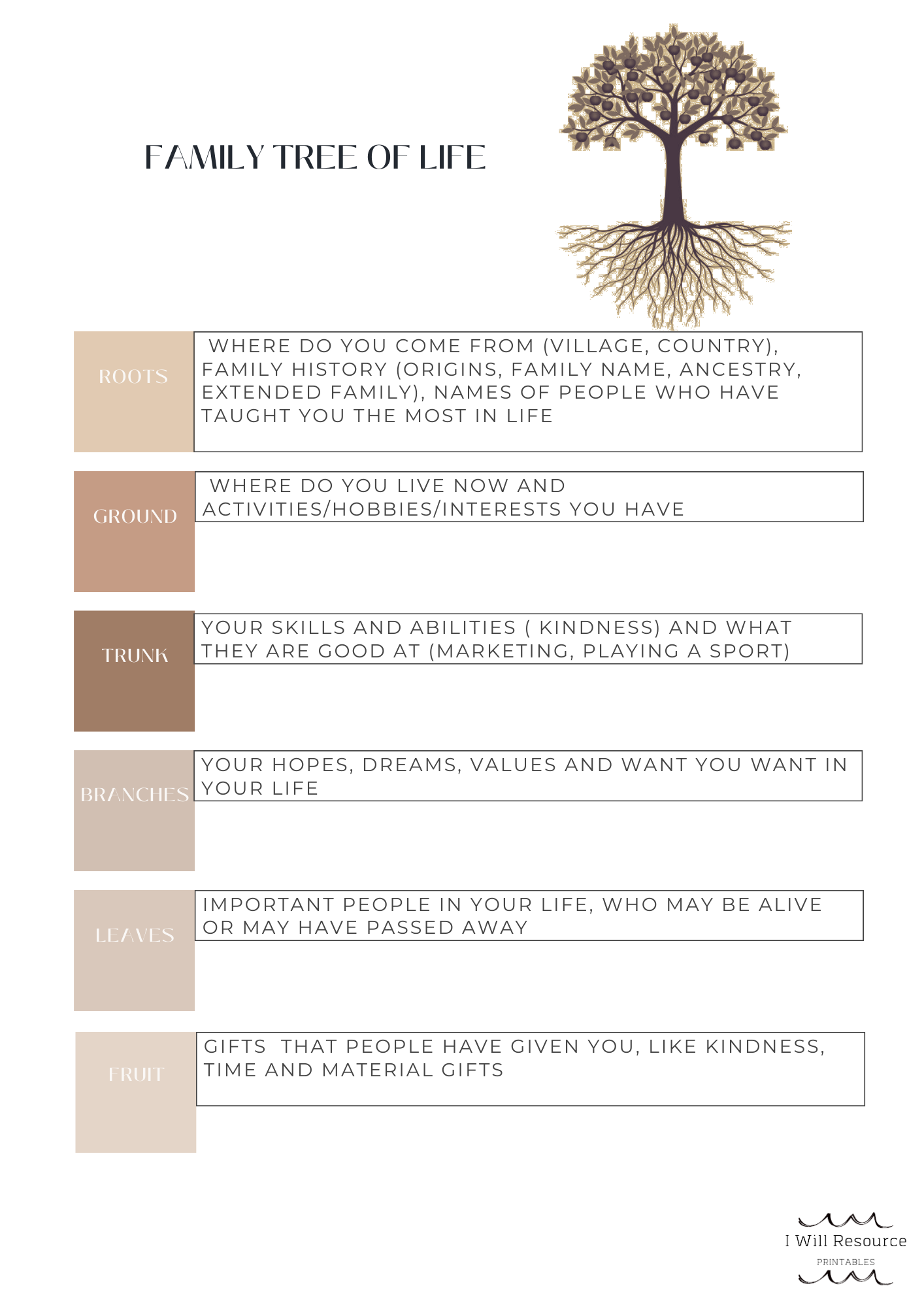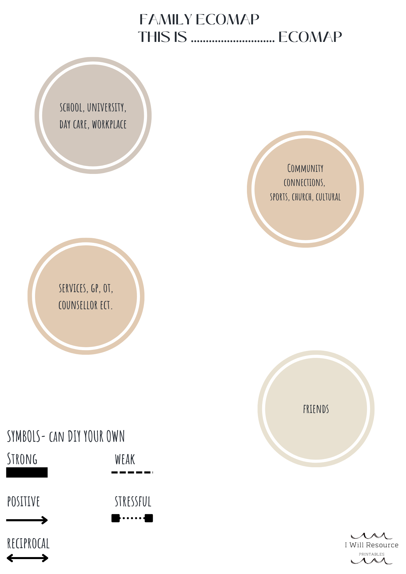 Ideas for use: Print out the book and put into a display folder. Use the book throughout your work with an individual or family. For individual work it will help bring the family into conversations. For family work, you can include the whole family including children. Children can help come up with symbols for the genogram, can share what they think the problem is and ideas for the Family's Tree of Life.